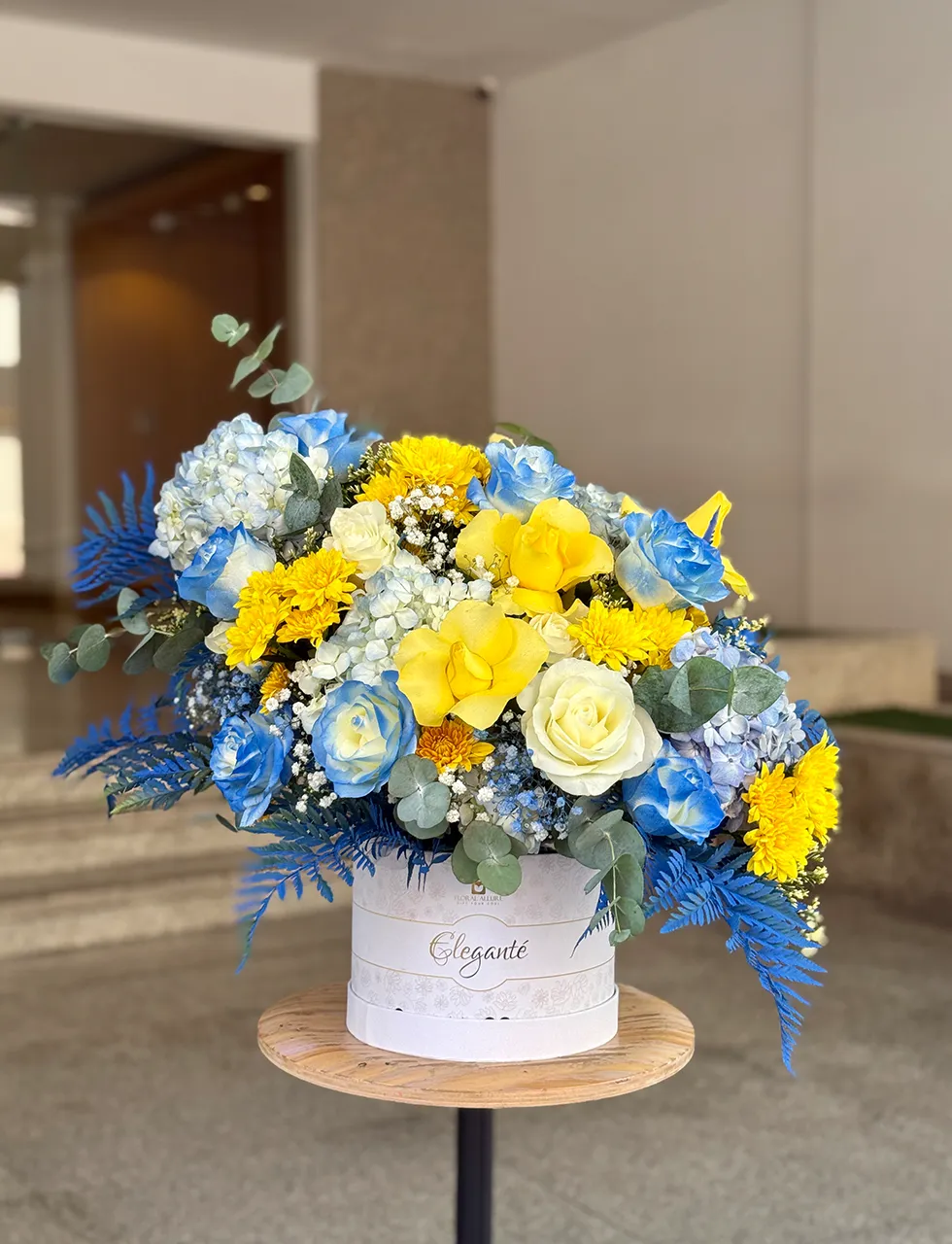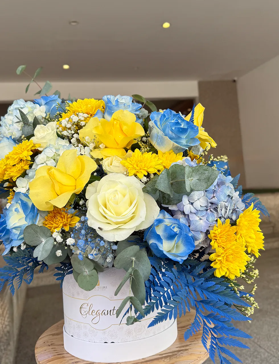 A refined expression of elegance, the Blush Garden Hat Box brings together the timeless beauty of roses, the soft fullness of chrysanthemums, and the delicate charm of hydrangeas, all complemented by fresh green foliage. Thoughtfully arranged in a premium hat box, this floral creation is perfect for gifting moments that matter, whether it is a celebration, a heartfelt gesture, or simply to brighten someone’s day. Designed to impress with its balance of texture, color, and sophistication, it’s a bouquet that feels as luxurious as it looks.