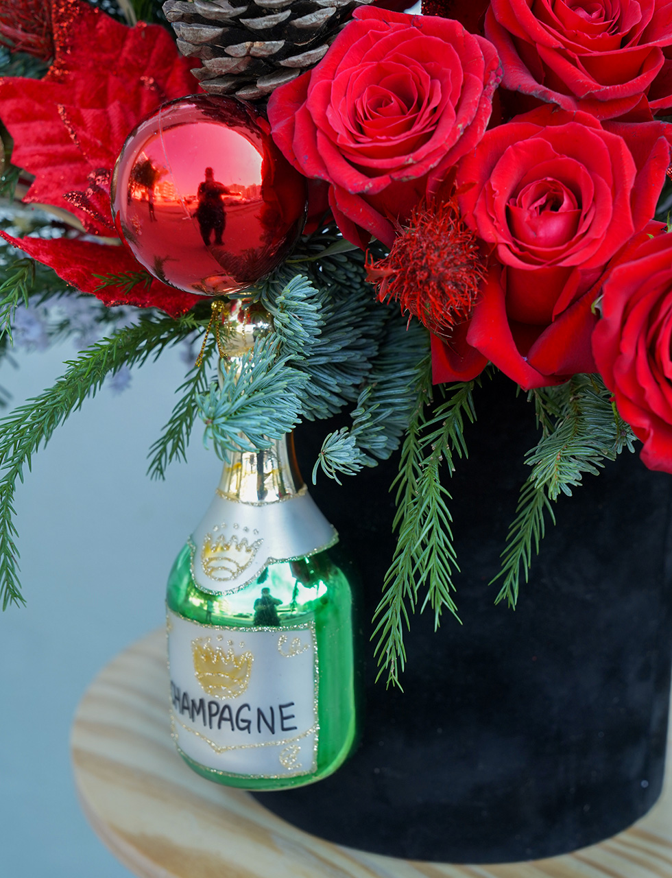 Christmas Eve Elegance by Floral Allure is a stunning hat box arrangement of vibrant red flowers paired with golden and red decorative balls. This festive masterpiece radiates holiday cheer, making it the perfect Christmas gift to brighten any celebration with elegance and warmth.