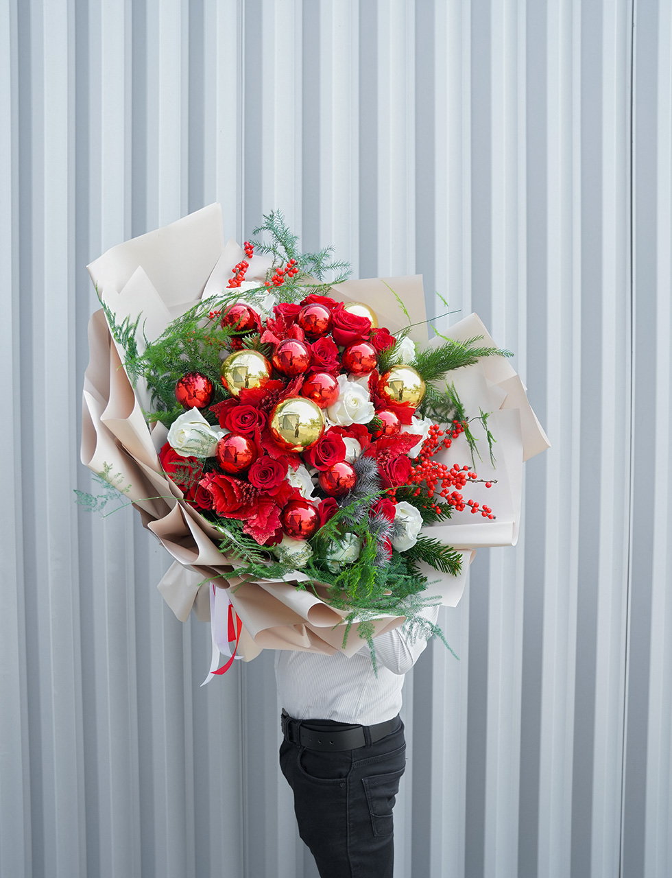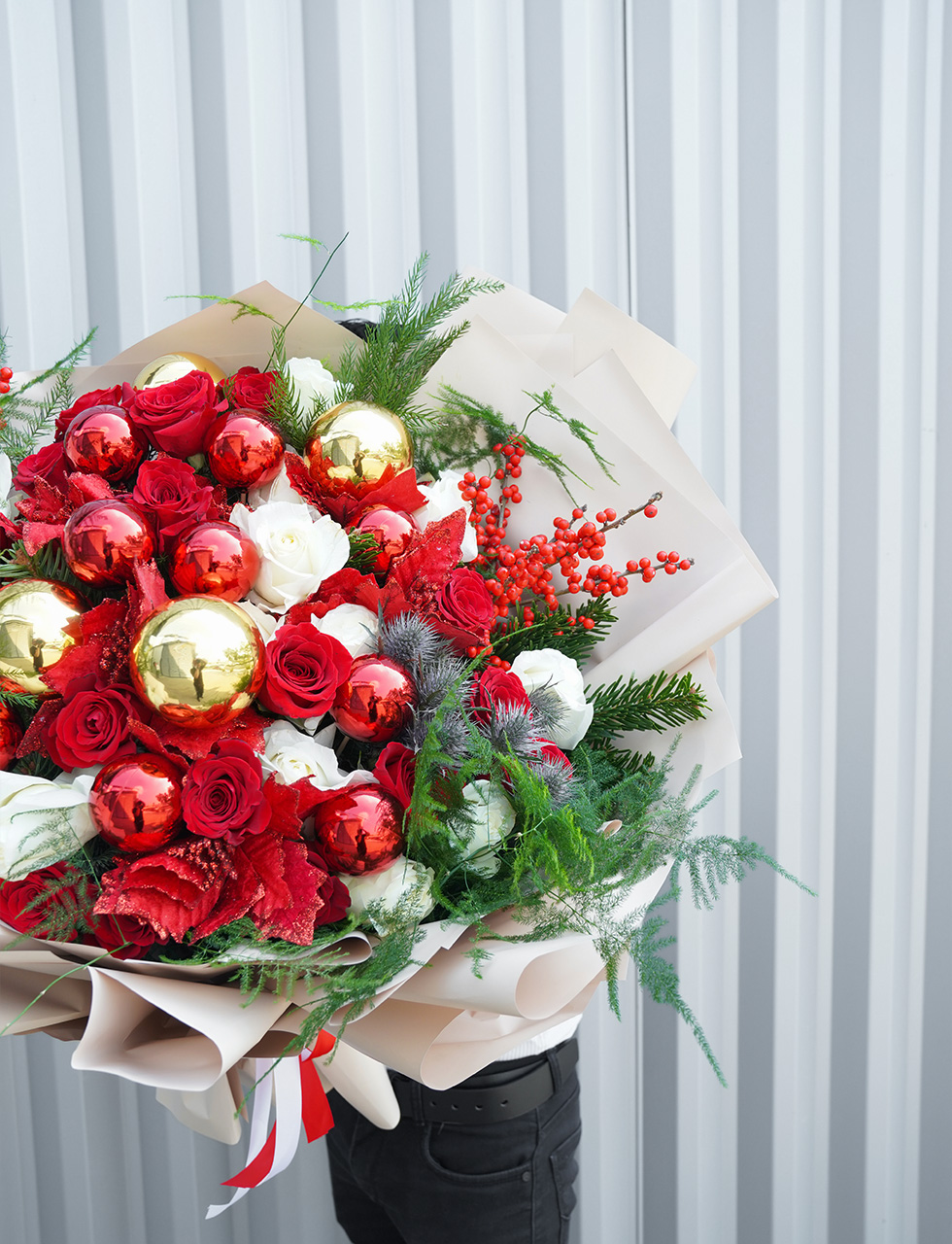 Celebrate the magic of Christmas with the Holly Jolly Bouquet by Floral Allure! Featuring vibrant red roses, snowy white carnations, and festive greenery, this stunning arrangement brings holiday cheer to any space. Perfect for gifting or decorating your home, it captures the spirit of the season with elegance and warmth.