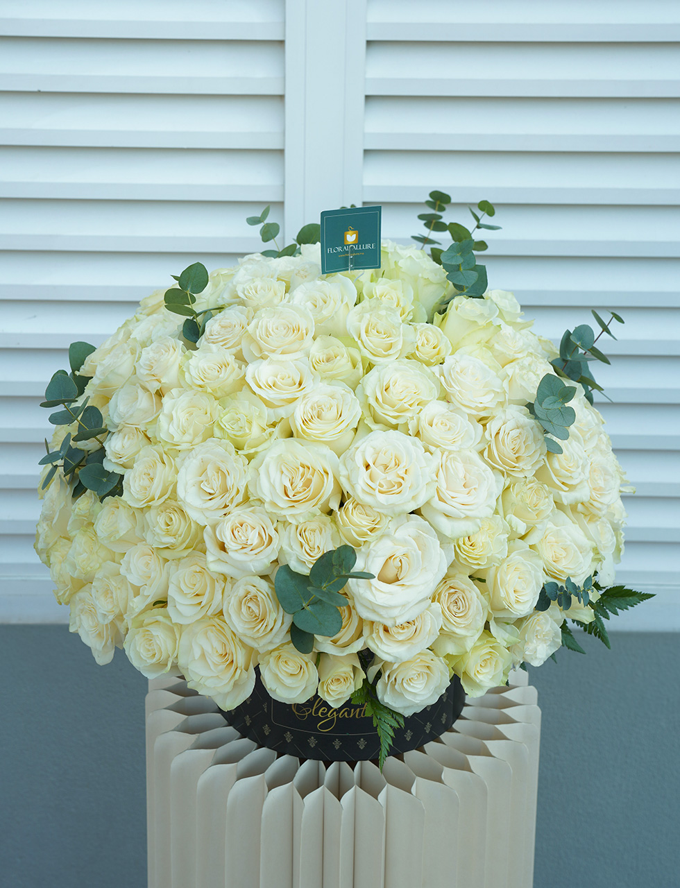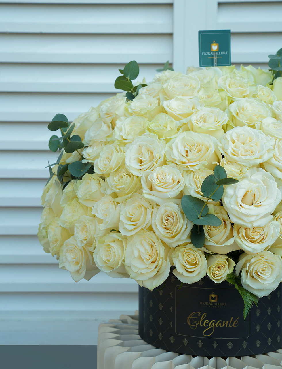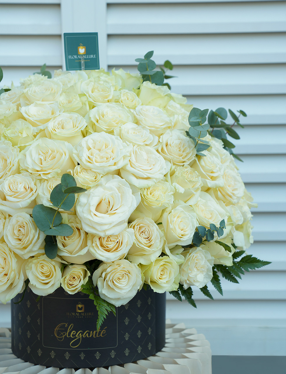 Elevate your Valentine’s Day celebration with Floral Allure’s exquisite Ivory Roses in Hat Box. This stunning arrangement features a dozen meticulously selected ivory-colored roses, elegantly presented in a charming hat box. The timeless beauty of ivory roses symbolizes purity and sophistication, making this arrangement a perfect expression of love and admiration. Surprise your special someone with this romantic gift that not only captivates the senses but also adds a touch of luxury to the occasion. Floral Allure’s attention to detail ensures a memorable and heartfelt gesture for a truly enchanting Valentine’s Day.