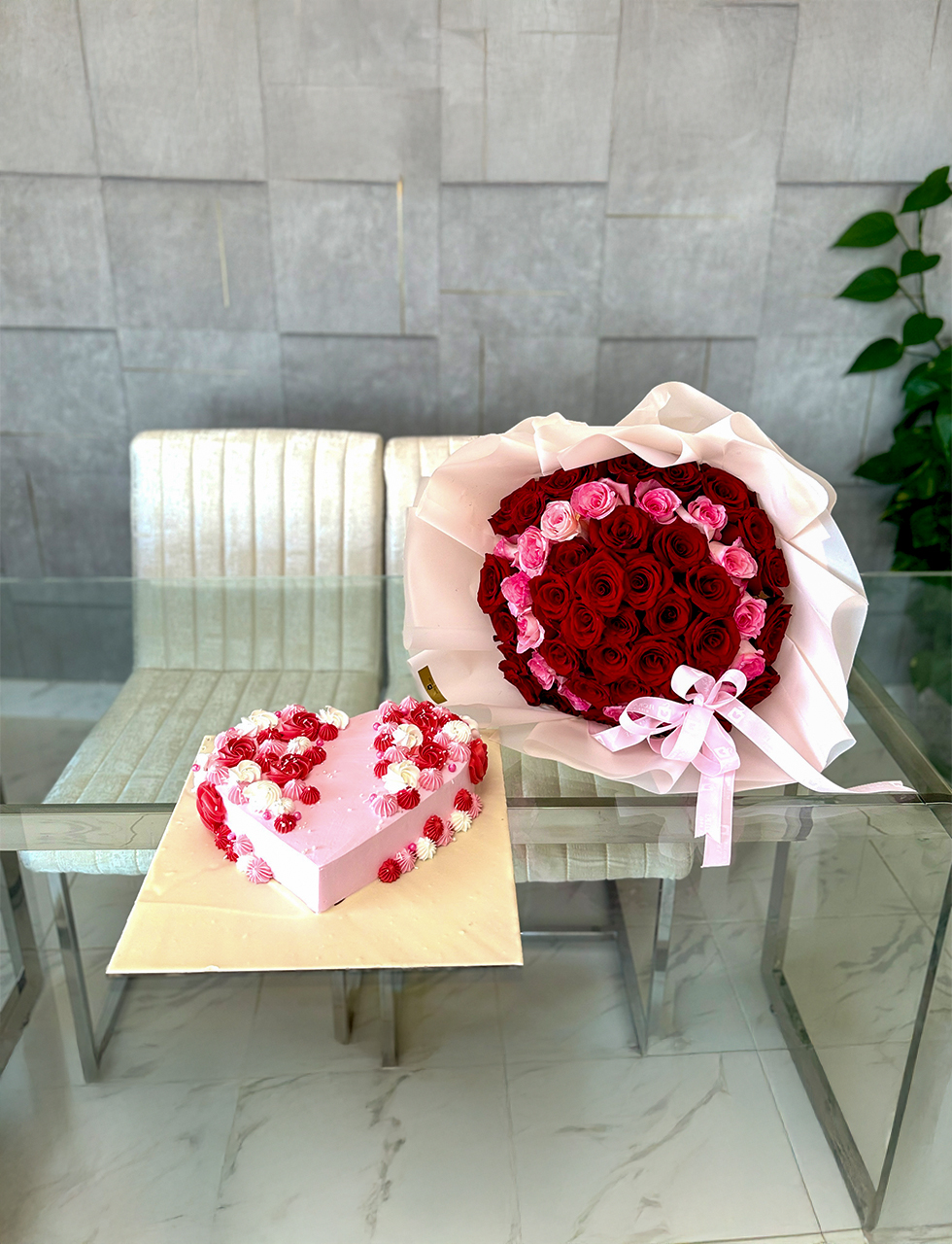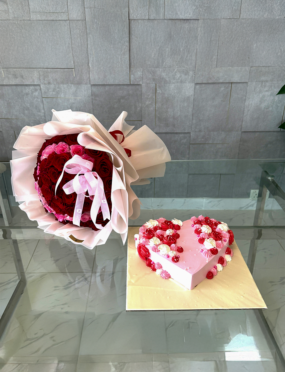 A classic Valentine’s Day pairing featuring a hand-tied bouquet of premium red roses and a heart-shaped semi-fondant cake. Crafted in a delightful strawberry-vanilla flavour and weighing 1.5 kg, this elegant combo is designed to express love in its most indulgent form. The bouquet and cake can be ordered together or separately.