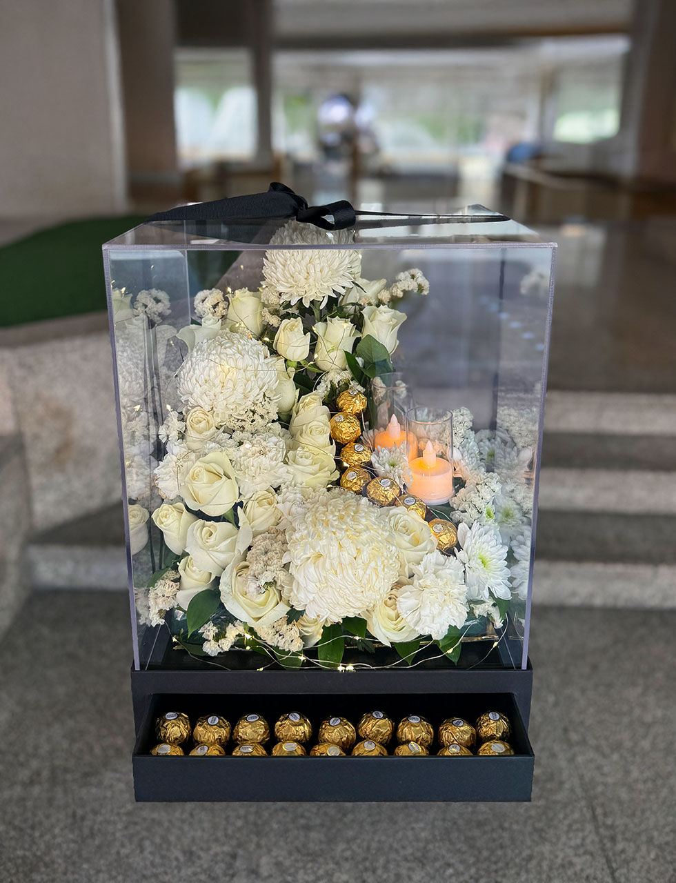 Gracefully curated to reflect the purity and warmth of Ramadan, this luxury transparent glass box features timeless white roses, elegant disbud and spray chrysanthemums, delicate baby’s breath, white carnations, and fresh green foliage. Complemented with 25 pieces of Ferrero Rocher chocolates, this refined floral arrangement makes a memorable Iftar gift for family, friends, and corporate occasions across the UAE. The box is available in black and red colour.