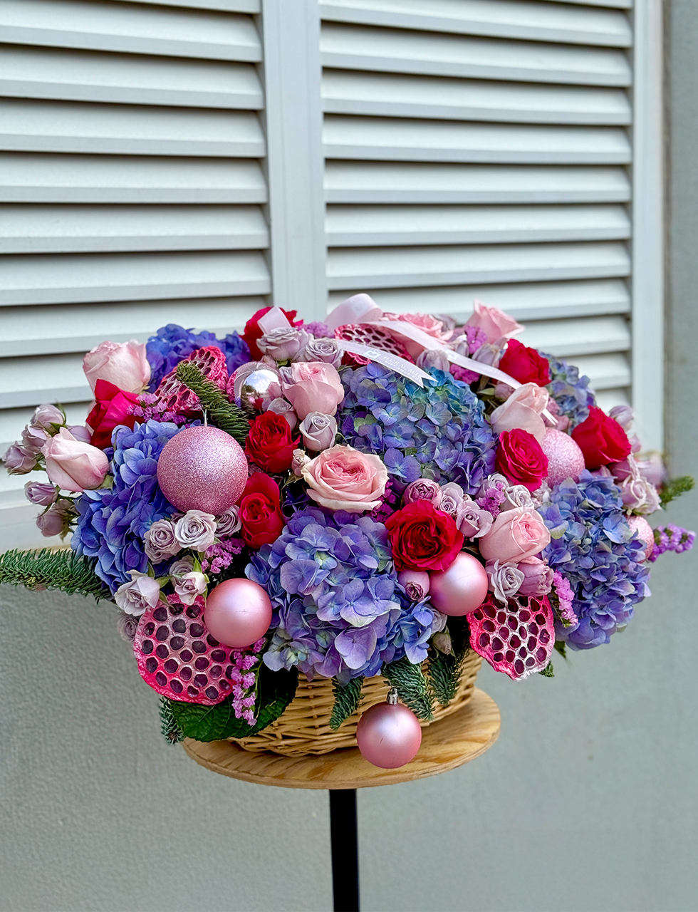 A charming hydrangea basket bouquet in shades of pink, red, and deep pink, beautifully complemented with tasteful Christmas decorations.