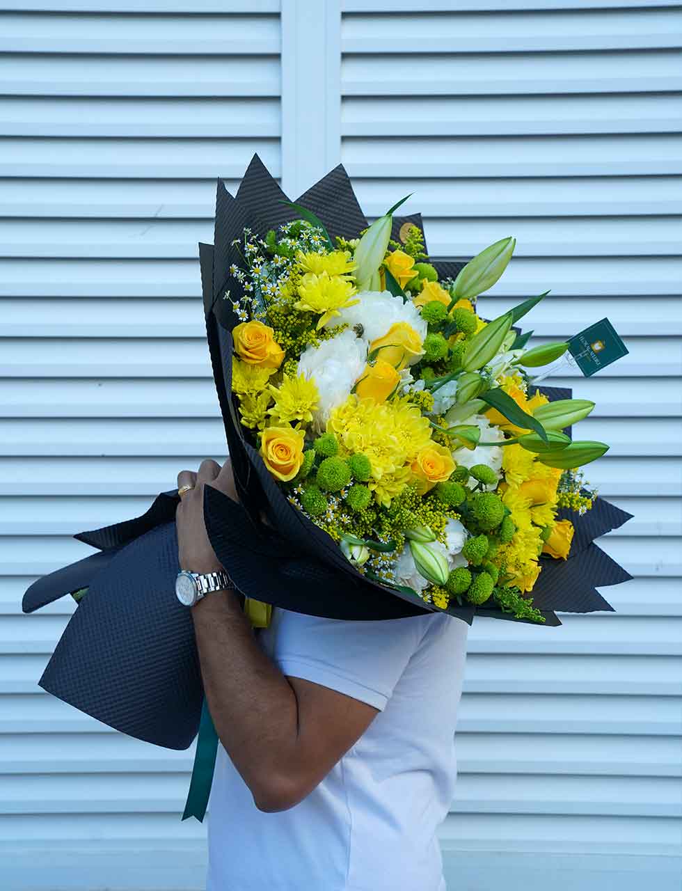 The Royal Flower Bouquet by Floral Allure is an exquisite arrangement that effortlessly blends the regal charm of chrysanthemums, the timeless beauty of yellow roses, the delicate elegance of lilies, the soothing allure of chamomile, and the luxurious presence of peonies. This meticulously curated bouquet is a perfect gift, embodying a harmonious symphony of colors and textures that symbolize love, admiration, and sophistication. Elevate any occasion with the enchanting grace of the Royal Flower Bouquet from Floral Allure.