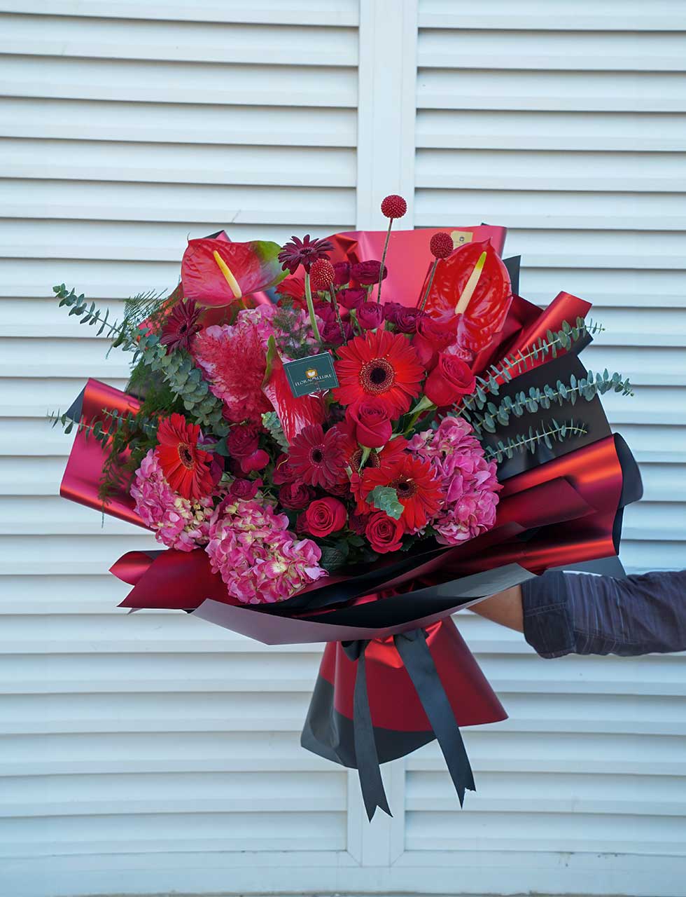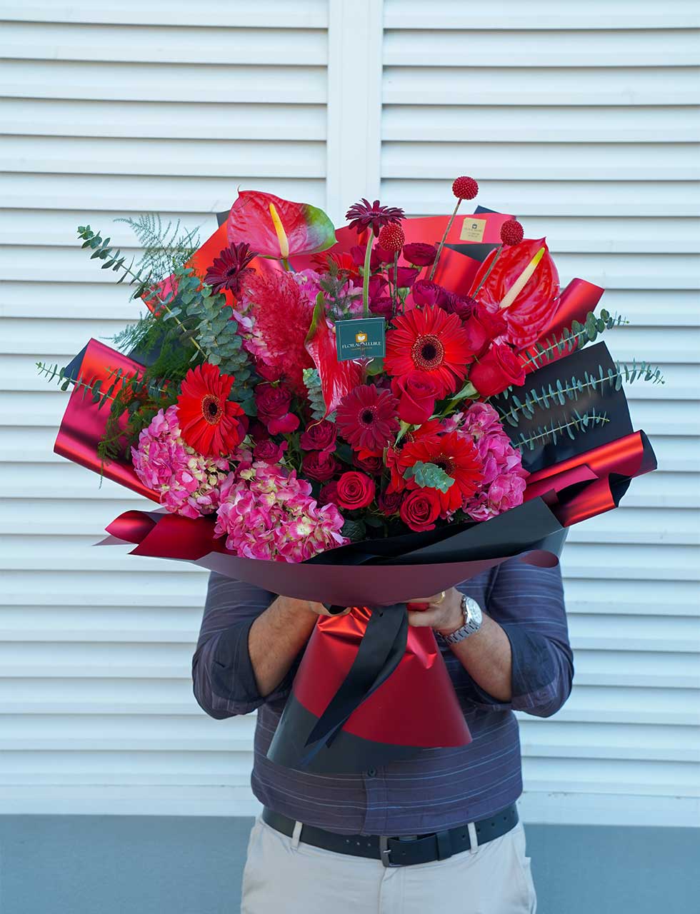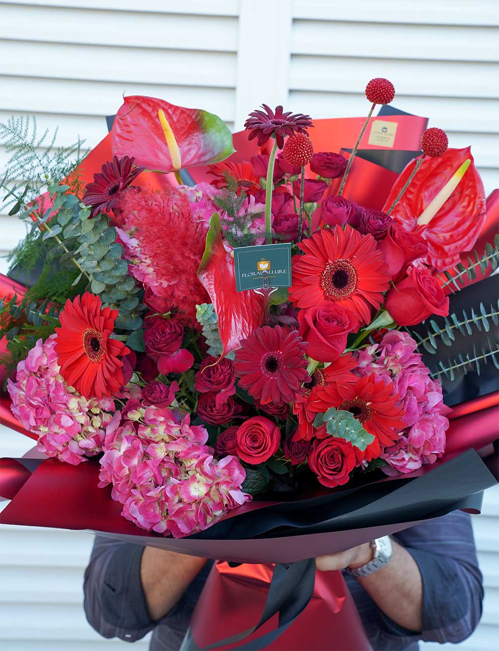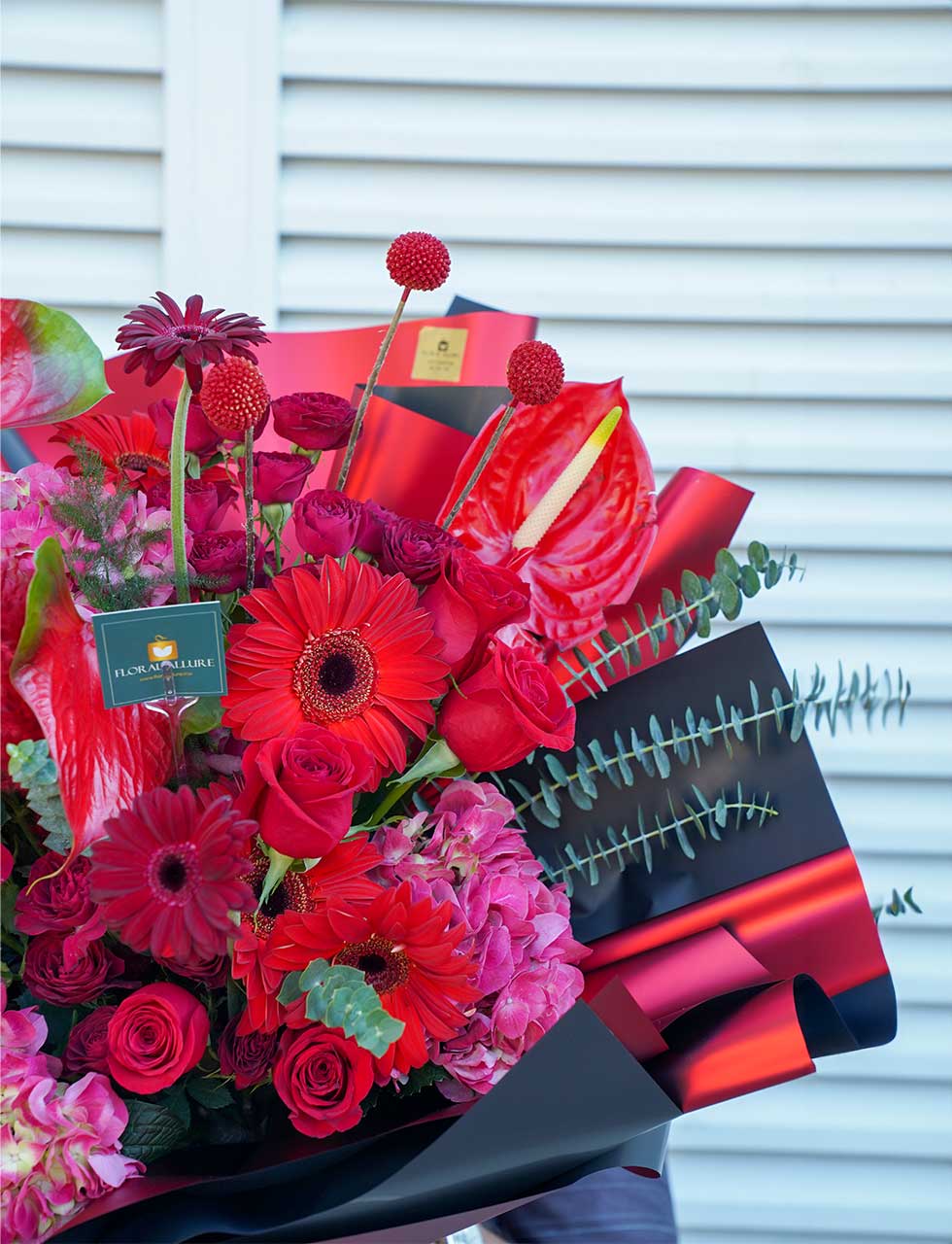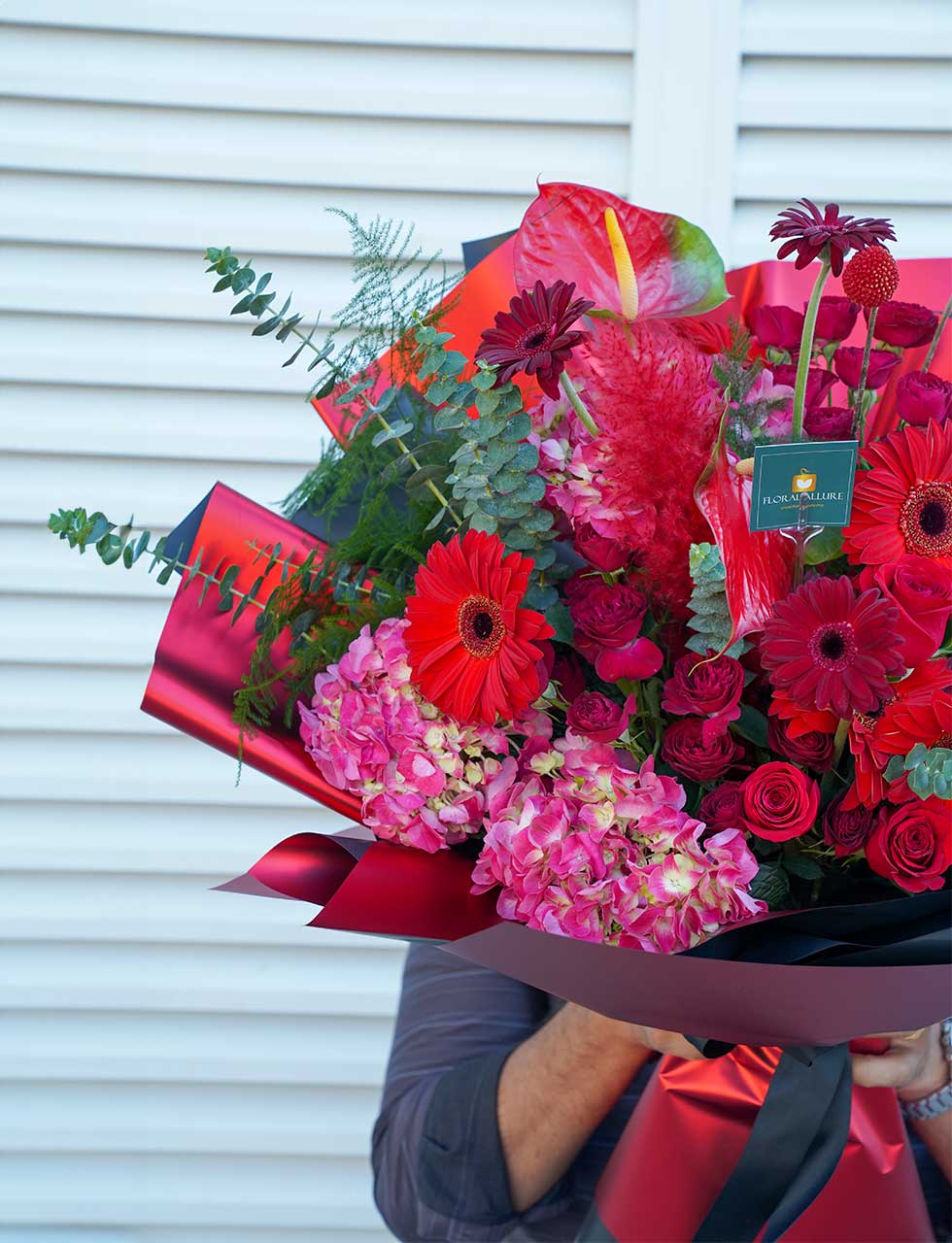 Embark on a journey of love with our exquisite Valentine’s Day bouquet – “Tender Tropics Affair.” This enchanting arrangement combines the exotic allure of anthurium, the delicate beauty of hydrangea, the vibrant charm of gerbera, the classic elegance of red roses, and the whimsical touch of spray roses and allium.