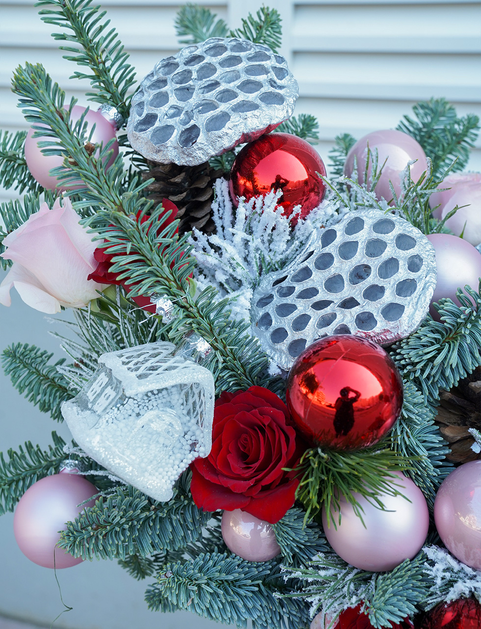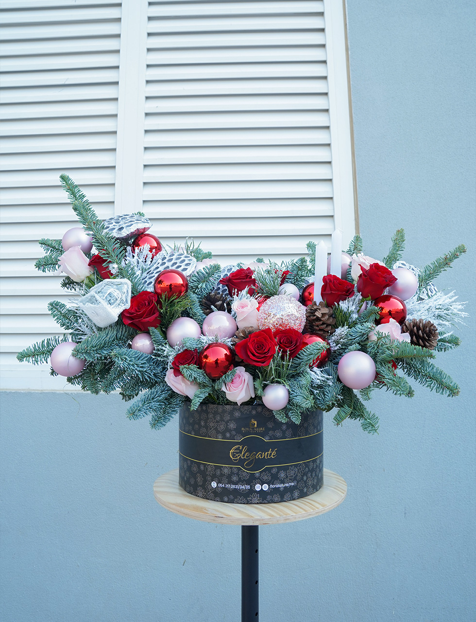 Celebrate the magic of Christmas with the Twinkling Tidings Box by Floral Allure. This stunning hat box features a delightful arrangement of pink and red flowers, radiating warmth and festive cheer. Perfect as a heartfelt gift or a charming centerpiece, it’s a beautiful way to spread holiday joy.