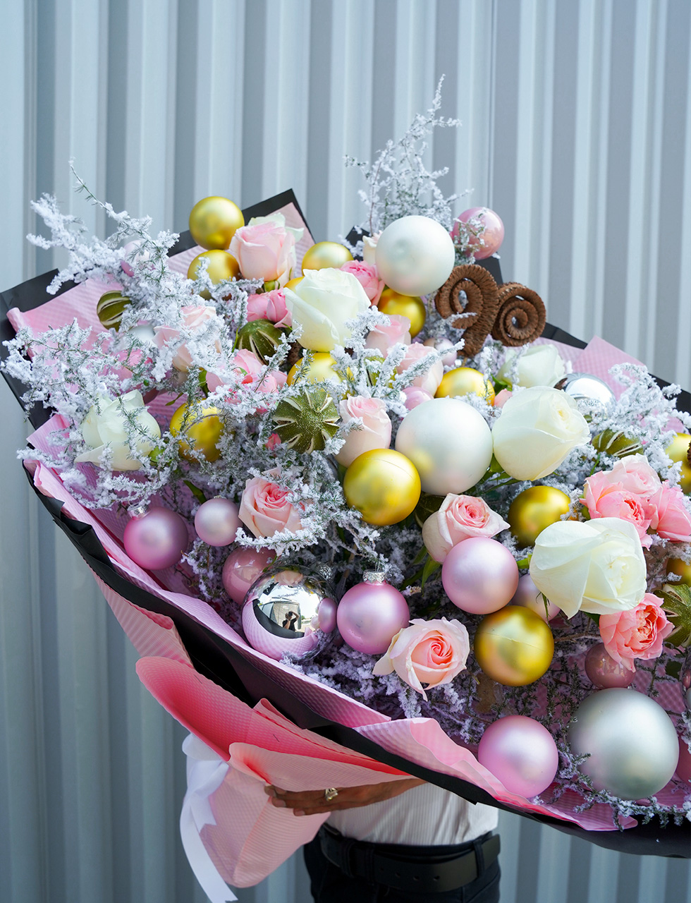 Celebrate the magic of Christmas with Whispering Winter Blooms by Floral Allure. This exquisite bouquet combines snowy white roses, deep red carnations, and touches of festive greenery, evoking the charm of a winter wonderland. Perfect as a heartfelt gift or a centerpiece for your holiday celebrations, this arrangement brings warmth and joy to every moment.